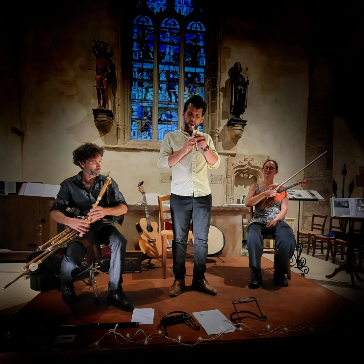 Voix, cordes, vents et percussions se retrouvent dans une balade musicale directe et sans frontières. Des mélodies baroques aux polkas effrénées, le trio s’adapte aussi bien à la confidence d’une petite chapelle qu’à l’effervescence d’un festival de musique folk en Bretagne et ailleurs.